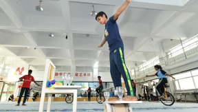 Trainees from Bangladesh practice at Hebei Wuqiao Acrobatic Art School in Wuqiao County, north China's Hebei Province, Aug. 20, 2025. More than 20 trainees from Bangladesh have been training hard in recent days at the Hebei Wuqiao Acrobatic Art School in Wuqia...