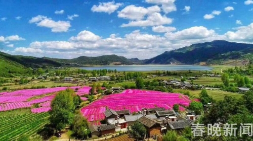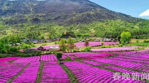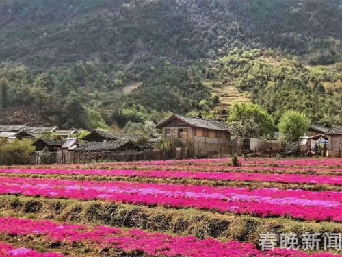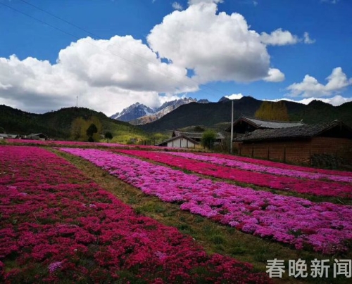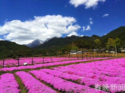 [InKunming--Yunnan] Behind the Jade Dragon Snow Mountain (Yulong Mountain) in Lijiang City, a small village named Wenhai has a field of moss phlox reaching their blooming peak recently. Bright-colored flowers form a painting-like landscape, accompanied by horses, log cabin and white snow mountain.