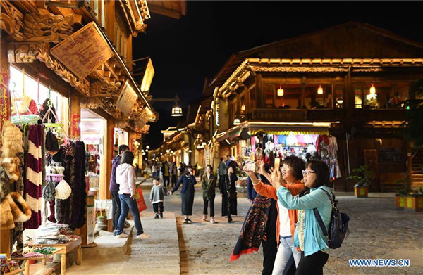 Photo taken on June 20, 2018 shows a night scenery of the ancient town of Dukezong in Shangri-la City in Diqing Tibetan Autonomous Prefecture, southwest China's Yunnan Province. The ancient town of Dukezong, established more than 1,300 years ago, is known for its Tibetan-style architectures. (Xinhua/Yang Zongyou)