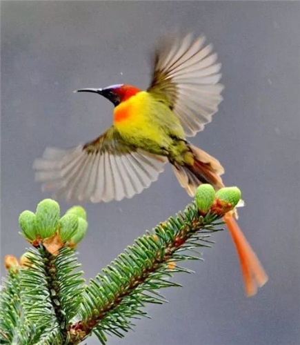 The length of the fire-tailed sunbird with gorgeous color reaches at 20 centimeters. They are small and exquisite. Bright feathers make them popular in Jiaozi snow mountain. It is the time that chicks learn how to fly. Male birds are “flight coach”, and they have a handsome red feather compared with female birds which are normally gray.