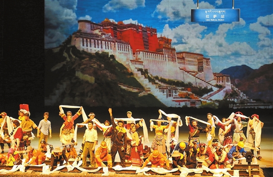Tian Lu dance drama, which reflects construction progress of Qinghai-Tibet railway, was played after the opening ceremony. With emotional body languages and dances, actors made every character of the drama alive on the stage. Tibetan dance elements were applied in the drama to show Tibetan compatriots' traits--simplicity and stability. Performed with catching background music, this dance drama told a road-building story mixed with love, friendship and family affection.