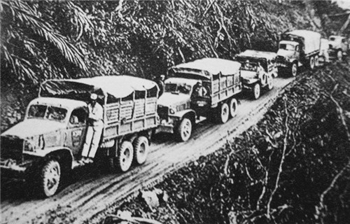 Trucks carry overseas Chinese from Southeast Asian countries to work on the road as volunteers in the 1940s. [File photo and Liu Chan/Xinhua]