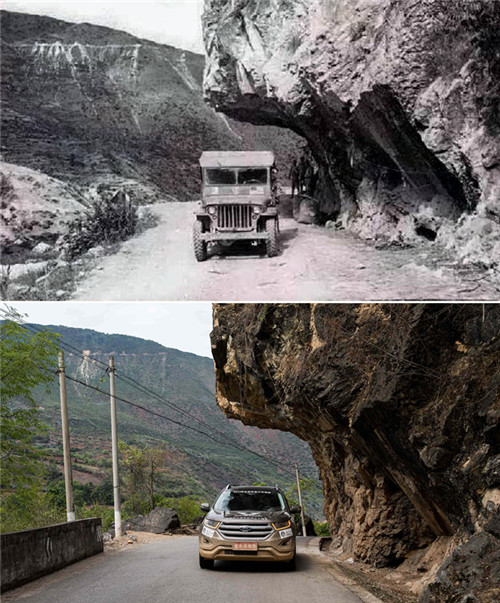 A section of the road at Tiger's Mouth in Longling county, Yunnan, in the 1940s (top) and in 2015. [File Photo and Liu Chan/Xinhua]