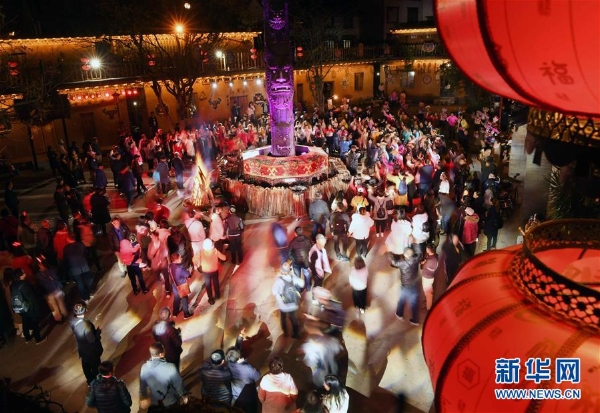 Tourists and yi people dance and sing at the bonfire party of Chuxiong Yiren ancient town. [Xinhua/Yang Zongyou]