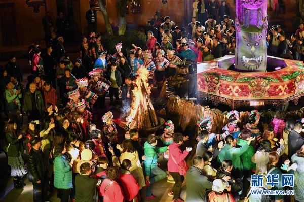Tourists enjoy the bonfire party in Chuxiong Yiren ancient town. [Xinhua/Yang Zongyou]