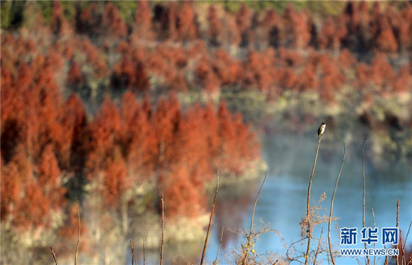Visitors admire the fine view of metasequoia wetland in Dianwei village. [Xinhua/Qinqing]