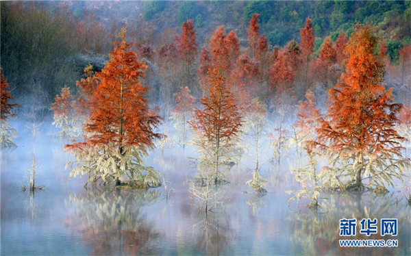 Metasequoia wetland in Dianwei village is enveloped in early morning mist. [Xinhua/Huchao]