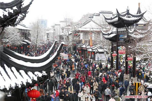Tourists visit Confucius Temple scenic area in Nanjing, east China's Jiangsu Province, Feb. 8, 2019. China's domestic tourism revenue gained 513.9 billion yuan (about 76.21 billion U.S. dollars) during the week-long Spring Festival holiday that ends Sunday, an annual increase of 8.2 percent, according to the Ministry of Culture and Tourism. A total of 415 million trips were made across the country during the holiday, rising by 7.6 percent year on year, according to the ministry. Traditional culture was one of the travelers' favorites during the holiday, as a survey by an institution under the ministry showed that about 40 percent of the travelers had visited museums on their trips. During the Spring Festival holiday last year, 386 million trips were made domestically, contributing to an increase of 475 billion yuan in China's travel revenue. (Xinhua/Wang Xin)