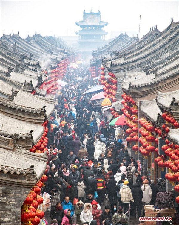 Tourists visit Pingyao, a tourist attraction in north China's Shanxi Province, Feb. 10, 2019. China's domestic tourism revenue gained 513.9 billion yuan (about 76.21 billion U.S. dollars) during the week-long Spring Festival holiday that ends Sunday, an annual increase of 8.2 percent, according to the Ministry of Culture and Tourism. A total of 415 million trips were made across the country during the holiday, rising by 7.6 percent year on year, according to the ministry. Traditional culture was one of the travelers' favorites during the holiday, as a survey by an institution under the ministry showed that about 40 percent of the travelers had visited museums on their trips. During the Spring Festival holiday last year, 386 million trips were made domestically, contributing to an increase of 475 billion yuan in China's travel revenue. (Xinhua/Liang Shengren)