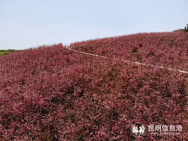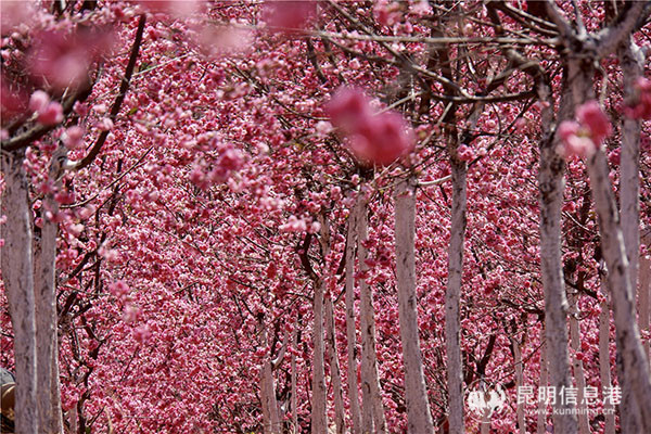 Large stretches of flowering cherry blossom sway in the breeze. [Su Wenqian/InKunming]