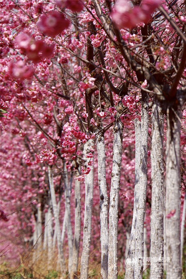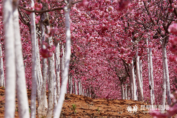 The cherry blossom trees are planted in a neat row, which makes the valley an ideal place to create fine photos. [Su Wenqian/InKunming]