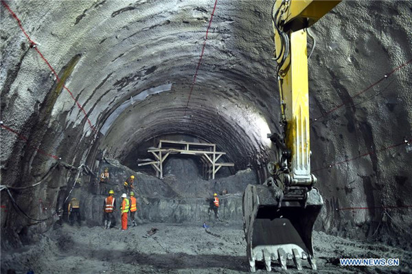 Workers remove slag in the Xinping tunnel of the China-Laos railway in Yuxi City, southwest China's Yunnan Province, April 11, 2019. Linking Yuxi City in Yunnan and the Lao capital Vientiane, the China-Laos railway is expected to be fully operational by the end of 2021. (Xinhua/Qin Qing)