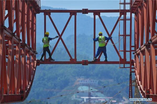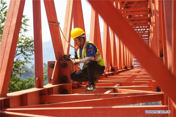 A worker fastens a screw at the construction site of the Monei River bridge of the China-Laos railway in Pu'er City, southwest China's Yunnan Province, April 12, 2019. Linking Yuxi City in Yunnan and the Lao capital Vientiane, the China-Laos railway is expected to be fully operational by the end of 2021. (Xinhua/Qin Qing)