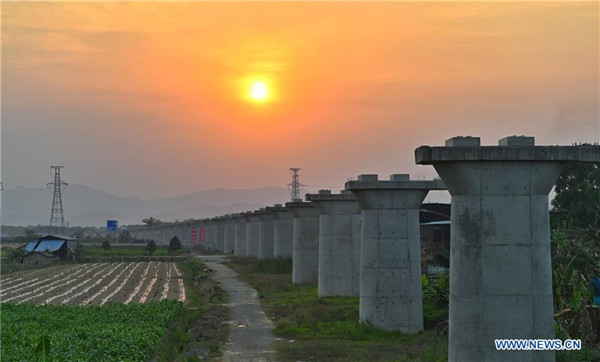 The Monei River bridge of the China-Laos railway is under construction in Pu'er City, southwest China's Yunnan Province, April 12, 2019. Linking Yuxi City in Yunnan and the Lao capital Vientiane, the China-Laos railway is expected to be fully operational by the end of 2021. (Xinhua/Qin Qing)