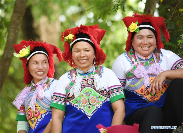 Three women of the Yi ethnic group watch a performance at Heiyudong Village of Yanshan County, southwest China's Yunnan Province, April 25, 2019. A cultural event was held in Yanshan County, where people of ethnic groups including Han, Zhuang, Miao, Yi and foreign tourists exchanged different customs and folk arts. (Xinhua/Yang Zongyou)