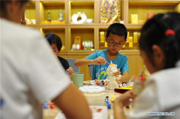 A boy colours a mascot of Forbidden City named "Zhuangzhuang" at an experience store for children at the Palace Museum in Beijing, capital of China, June 1, 2016. (Xinhua/Li Renzi)