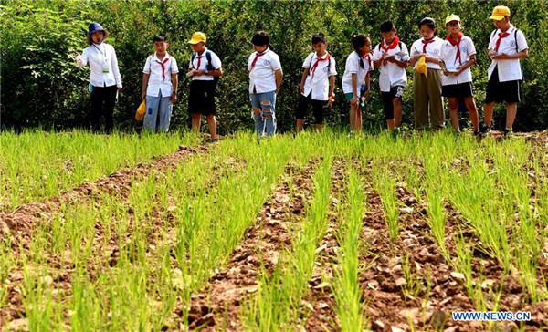 Students from Qiyi Primary School of Yuanqu County learn agricultural knowledge at Xiabo Village of Wangmao Township in Yuncheng, north China's Shanxi Province, July 3, 2019. (Photo by Cui Songliang/Xinhua)