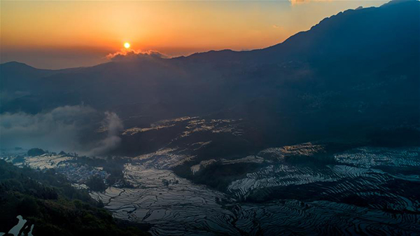 Aerial photo taken on April 4 shows the scenery of Hani terraced fields in the dawn of Yuanyang County. [Xinhua/Hu Chao]
