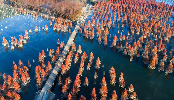 Aerial photo taken on January 5 shows the scene of metasequoia glyptostroboides Wetland in Kunming City, Yunnan Province. [Xinhua/Qin Qing]