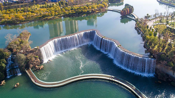 Aerial photo taken on January 5 shows a view of Kunming Waterfall Park. [Xinhua/Hu Chao]