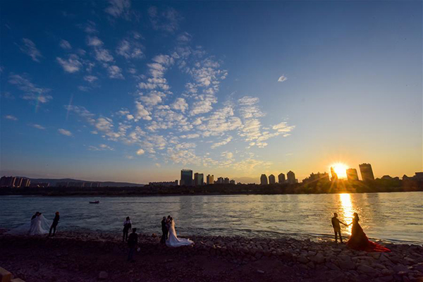 Photo taken on November 29, 2018, shows a couple are taking wedding photos along the Langcang River in Jinghong City. [Xinhua/Jiang Wenyao]