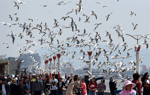Photo taken on March 15, 2016, shows that people get along well with black-headed gulls at the bank of Dianchi Lake. [Xinhua/Lin Yiguang]