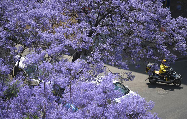 Photo taken on April 24 that breathtaking purple jacaranda blooming with wind in Kunming. [Xinhua/Qin Qing]