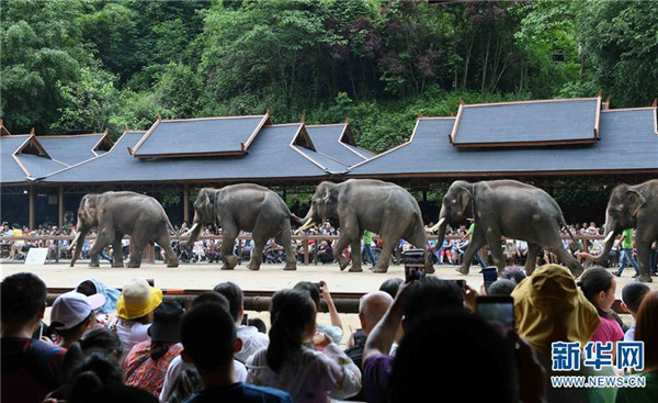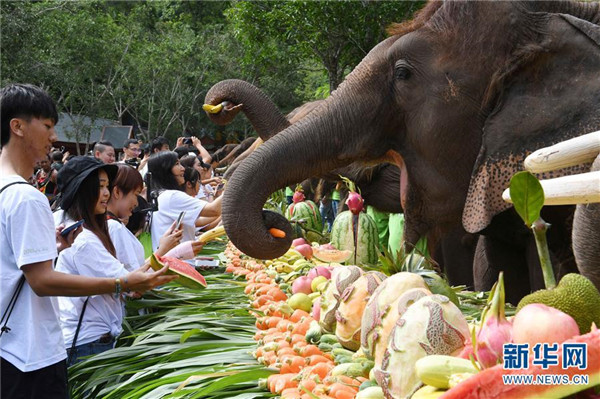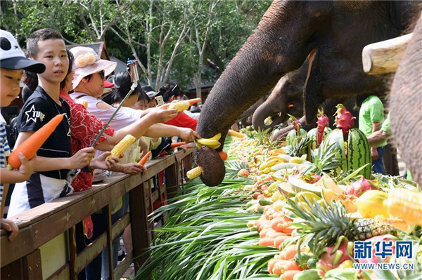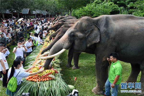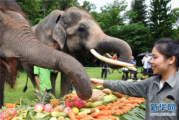 [InKunming--Yunnan] More than 20 Asian elephants enjoyed bananas, apples and carrots fed by volunteers at the Wild Elephant Valley scenic spot in Yunnan’s Xishuangbanna on August 12, the World Elephant Day.