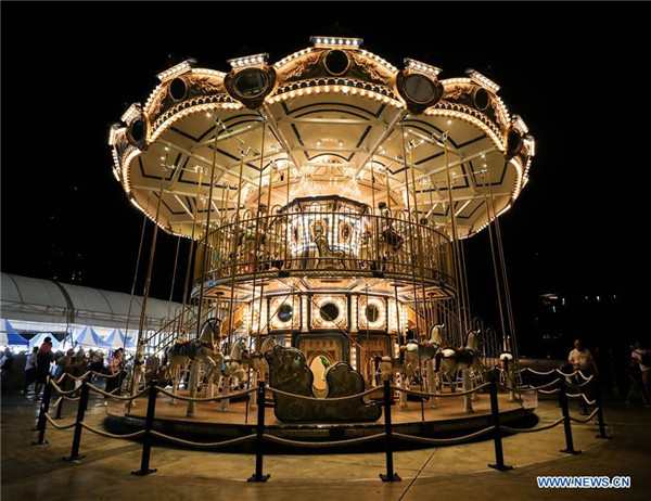 Visitors take a merry-go-around at the Asiatique night market in Bangkok, Thailand, Aug. 10, 2019. (Xinhua/Zhang Keren)