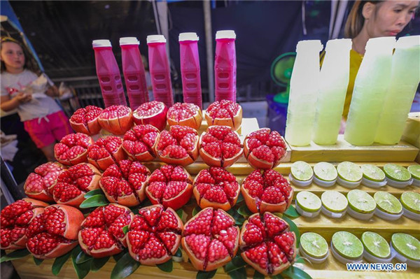 Fresh fruits and juice are seen at the Asiatique night market in Bangkok, Thailand, Aug. 10, 2019. (Xinhua/Zhang Keren)