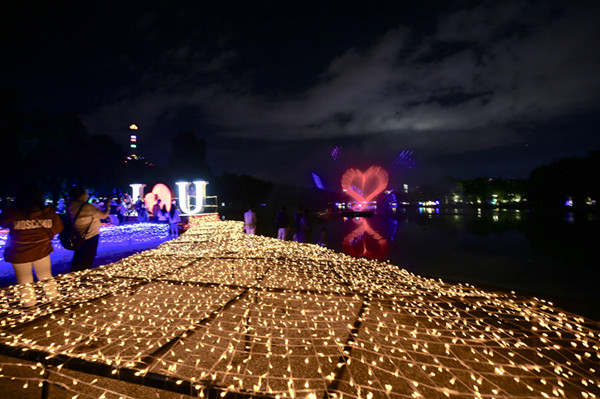 Mid-Autumn Festival performances and high-tech light shows given by Daguan Park attracted numerous visitor to celebrate festival, experience Chinese culture and admire the beauty of the park in the night. A waterway between lotus was specially set to allow performers in elegant Chinese han clothes to play Chinese pipa on boats.