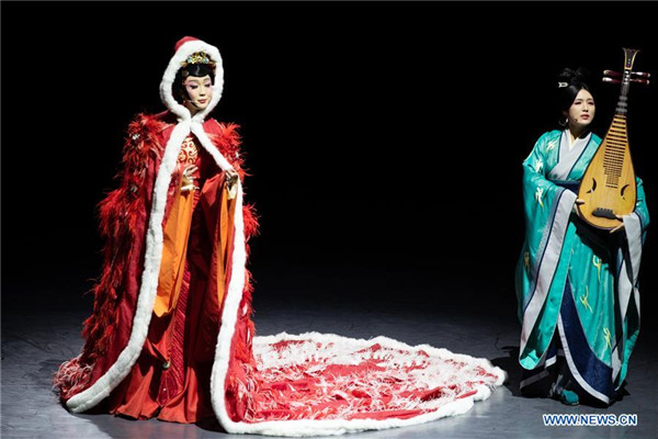 Actors perform in "Lady Zhaojun" at the Thailand Culture Center in Bangkok, Thailand, Oct. 5, 2019. The theatrical musical Lady Zhaojun of China's well-known singer Li Yugang made its debut here on Saturday night and would also be performed on Sunday night. Wang Zhaojun, who lived some 2,000 years ago in Han dynasty, won big rounds of applause in the Thailand Culture Center. (Xinhua)