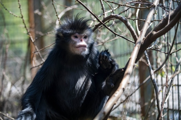 A rescued Nujiang River golden monkey rests in a residence imitating wild environment at a protention center in the Gaoligong Mountains, southwest China's Yunnan Province, on March 12, 2021. (Xinhua/Chen Xinbo)