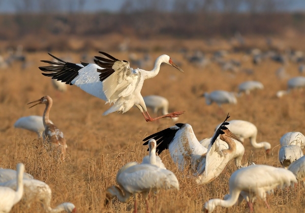 Rated as critically endangered on the International Union for Conservation of Nature Red List, the Siberian white crane, also known as the snow crane, have seen their numbers dwindle to 4,000, with only a single migrating route left -- the east route to Poyang Lake.