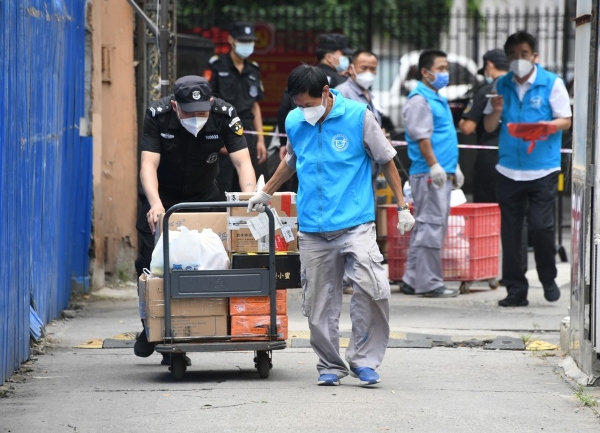 A volunteer (front, R) and a security worker (front, L) deliver necessities ordered by residents under home quarantine at a community in Haidian District, Beijing, capital of China, Aug. 3, 2021. (Xinhua/Ren Chao)