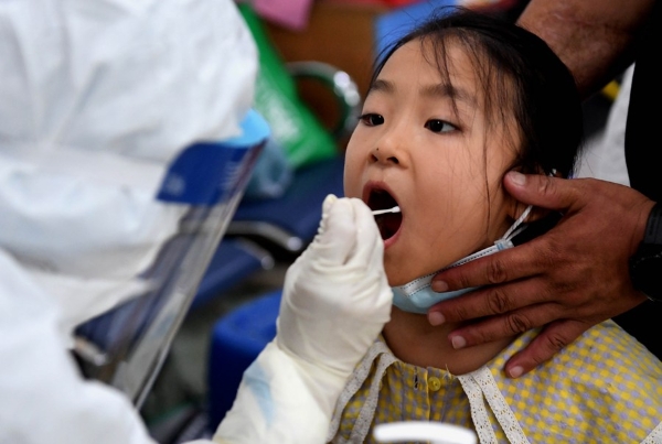 A medical worker takes a swab sample from a child for COVID-19 nucleic acid testing in Erqi District of Zhengzhou, central China's Henan Province, Aug. 1, 2021. (Xinhua/Li An)