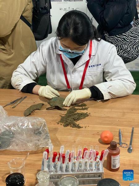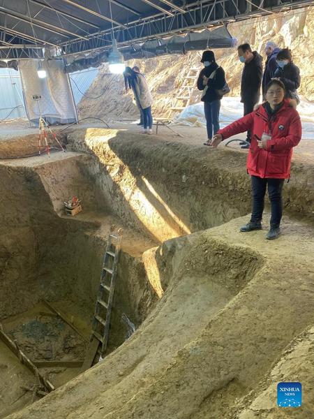 A staff member introduces at the Liulihe relic site in Beijing, capital of China, Dec. 7, 2021. Chinese archaeologists have recently unearthed a significant number of artifacts dating back to the Western Zhou Dynasty (1046-771 B.C.) at a relic site in Beijing, which is expected to unravel the mystery of the ancient Yan kingdom. (Xinhua/Luo Xin)