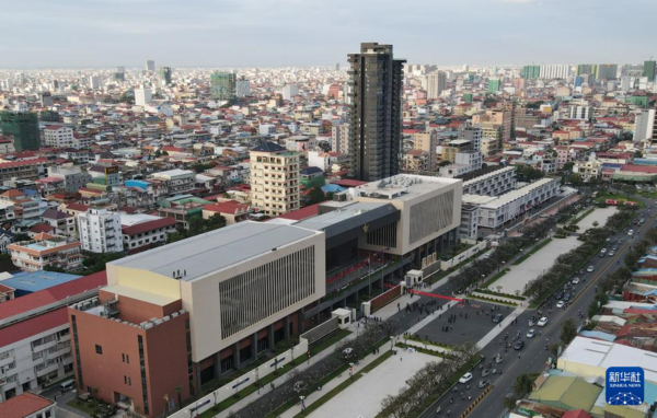 Aerial photo taken on Dec. 29, 2021 shows the new office building of the Ministry of National Defense in Phnom Penh, Cambodia. Cambodia on Wednesday inaugurated the new office building of the Ministry of National Defense in central area of the capital Phnom Penh. (Photo by Ly Lay/Xinhua)