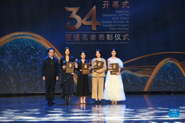 Nominees for the Best Actress and related representatives pose for a photo with a presenter during the 34th China Golden Rooster Nominee Awards Ceremony in Xiamen, southeast China's Fujian Province, Dec. 28, 2021. The China Golden Rooster and Hundred Flowers Film Festival kicked off on Tuesday in the city of Xiamen, with foreign films joining the race for China's top film awards for the first time. The event, which runs until Dec. 30, will see nominees compete in 20 award categories for the 34th China Golden Rooster Awards. (Xinhua/Lin Shanchuan)