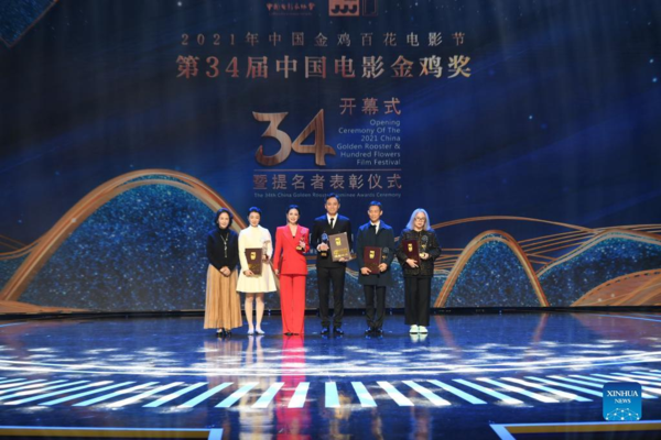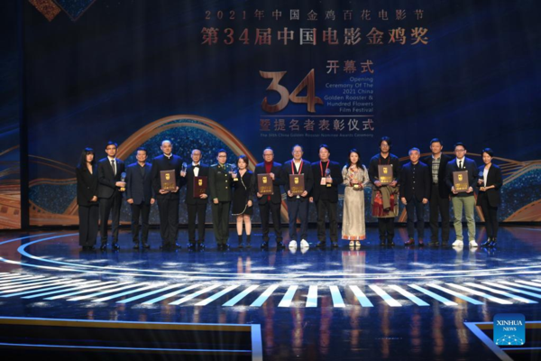 Nominees for the Best Director and related representatives pose for a photo with presenters during the 34th China Golden Rooster Nominee Awards Ceremony in Xiamen, southeast China's Fujian Province, Dec. 28, 2021. The China Golden Rooster and Hundred Flowers Film Festival kicked off on Tuesday in the city of Xiamen, with foreign films joining the race for China's top film awards for the first time. The event, which runs until Dec. 30, will see nominees compete in 20 award categories for the 34th China Golden Rooster Awards. (Xinhua/Lin Shanchuan)