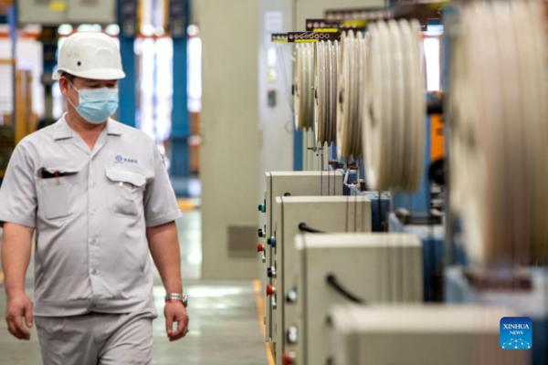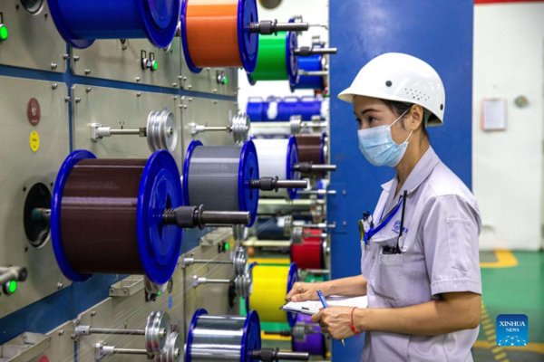 A worker checks cables at the Thai-Chinese Rayong Industrial Zone in Rayong province, Thailand, on Dec. 29, 2021. The Thai-Chinese Rayong Industrial Zone, which is located at the east coast of Thailand, has attracted more than 170 enterprises. (Xinhua/Wang Teng)