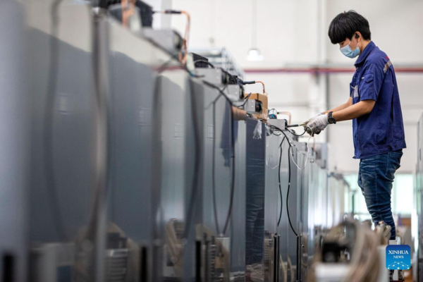 A worker checks refrigerators at the Thai-Chinese Rayong Industrial Zone in Rayong province, Thailand, on Dec. 29, 2021. The Thai-Chinese Rayong Industrial Zone, which is located at the east coast of Thailand, has attracted more than 170 enterprises. (Xinhua/Wang Teng)