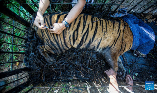 A veterinary gives a medicine to a 3-year-old female wild Sumatran tiger inside a cage after it was rescued and evacuated by West Sumatra Natural Resources Conservation Agency (BKSDA) from oil palm plantation for observation at Mauna Hilia village in Agam district, West Sumatra, Indonesia, Jan. 11, 2022. (Photo by Andri Mardiansyah/Xinhua)