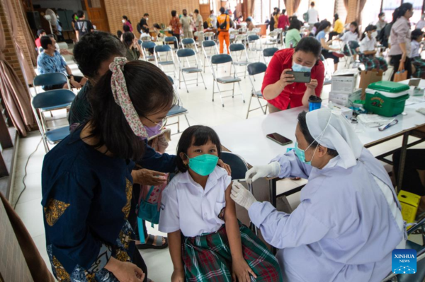 A child receives the COVID-19 vaccine in Jakarta, Indonesia, Jan. 11, 2022. The Indonesian government continues to intensify the vaccination of children aged 6 to 11 throughout the country. (Xinhua/Veri Sanovri)