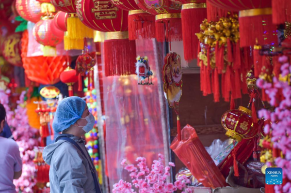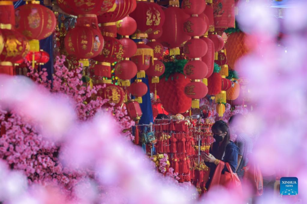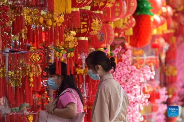 People select decorations for the upcoming Chinese Lunar New Year at a market in Jakarta, Indonesia, Jan. 13, 2022. (Xinhua/Veri Sanovri)