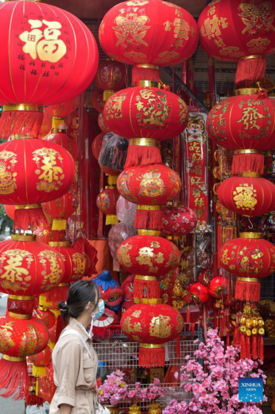 A woman passes a shop selling decorations for the upcoming Chinese Lunar New Year at a market in Jakarta, Indonesia, Jan. 13, 2022. (Xinhua/Veri Sanovri)