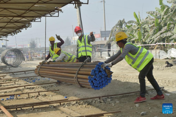 A Chinese engineer (2nd R) gives instructions as workers build an expressway which bypasses Dhaka, capital of Bangladesh, Jan. 4, 2022.