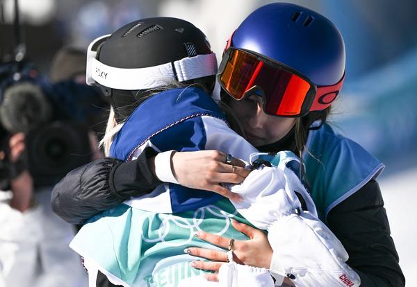 When Gu secured the top place of the podium at Big Air Shougang, she did not leave the venue. Instead, she hugged to comfort Ledeux, who missed the gold by faltering on her third run.