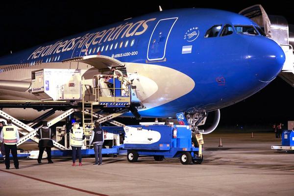 Staff members unload Chinese COVID-19 vaccines at the Ezeiza International Airport, Buenos Aires, Argentina, April 1, 2021. (Photo by Martin Zabala/Xinhua)