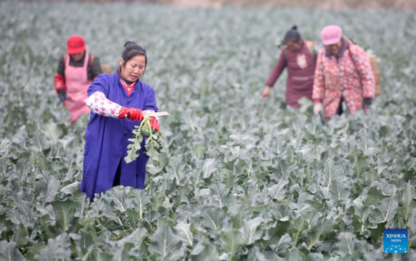 Farmers reap broccoli at an agricultural base in Wuliqiao Village of Yuping Dong Autonomous County in Tongren City, southwest China's Guizhou Province, Feb. 19, 2022. Saturday marks the day of Yushui, or Rain Water, the second of the solar terms. As Yushui arrives, the temperature will rise and rain will become frequent. Farmers across Guizhou are busy with spring agricultural production. (Photo by Liu Dejun/Xinhua)